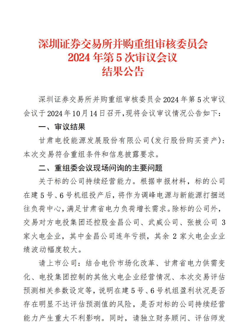 深交所并購重組審核委員會10月14日召開的2024年第5次審議會議結(jié)果公告顯示,甘肅能源發(fā)行股份購買資產(chǎn)交易符合重組條件和信息披露要求。從并購重組審核委員會現(xiàn)場問詢的主要問題來看,主要集中在標(biāo)的公司持續(xù)經(jīng)營能力方面。