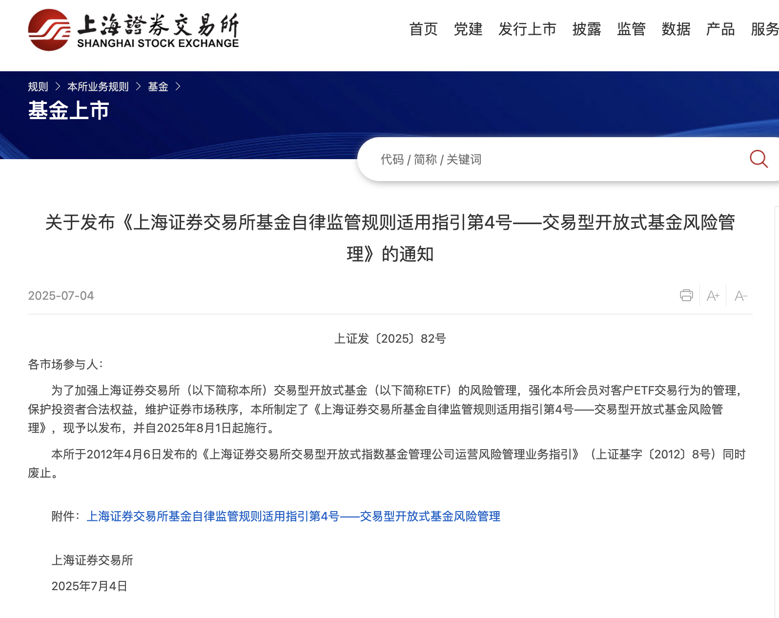 本報訊 (記者毛藝融)7月4日,記者從上海證券交易所獲悉,上交所修訂并發(fā)布《上海證券交易所基金自律監(jiān)管規(guī)則適用指引第4號——交易型開放式基金風(fēng)險管理》(以下簡稱《ETF風(fēng)險管理指引》)。這是貫徹落實中國證監(jiān)會《促進資本市場指數(shù)化投資高質(zhì)量發(fā)展行動方案》,強化ETF風(fēng)險管理,更好保護投資者合法權(quán)益的重要舉措。