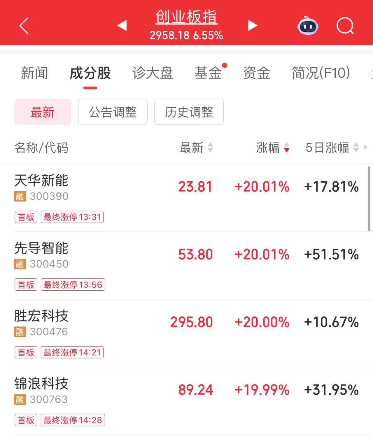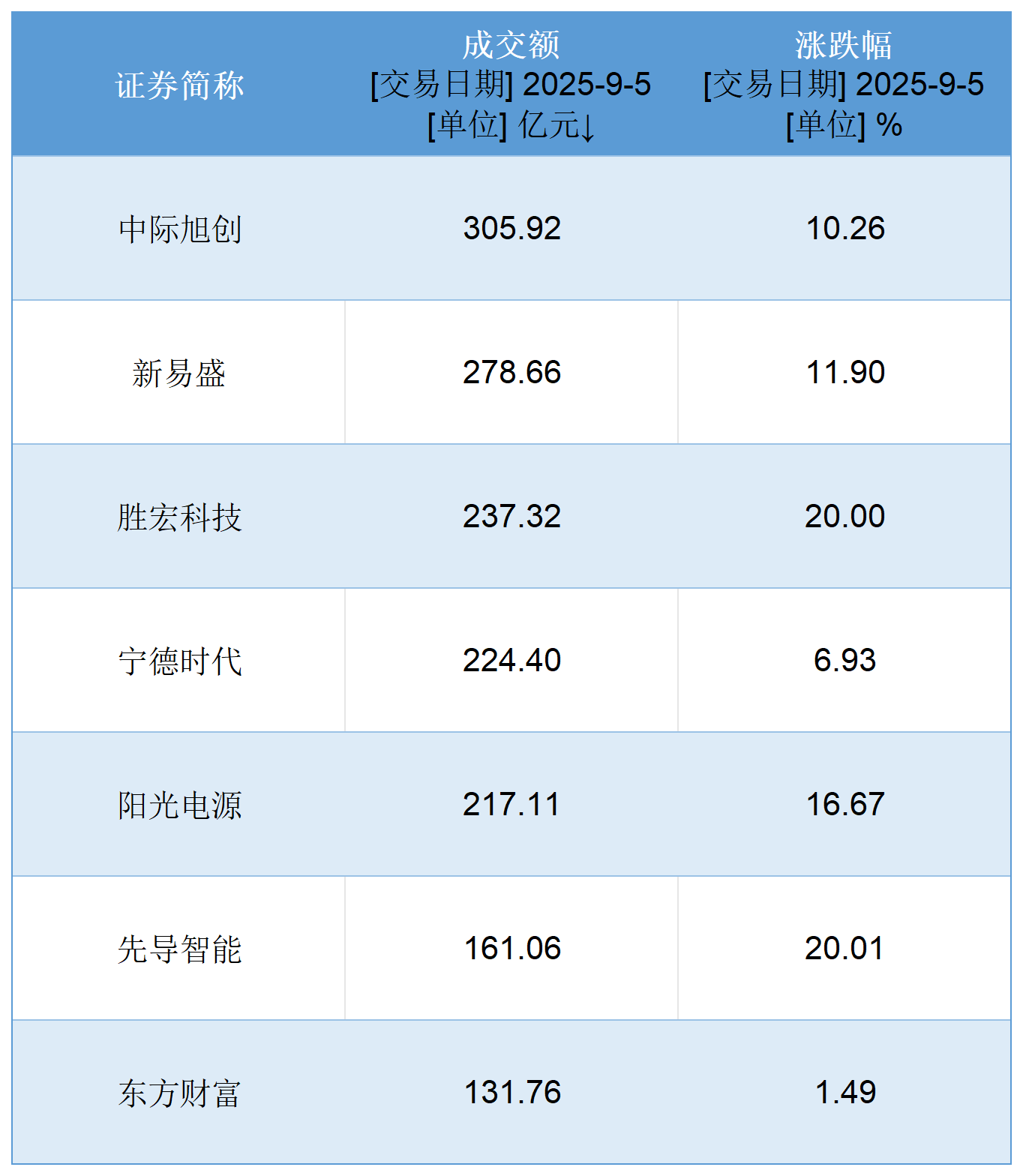 創(chuàng)業(yè)板指成分股中,天華新能、先導(dǎo)智能、勝宏科技、錦浪科技等4只個(gè)股漲停。Wind資訊數(shù)據(jù)顯示,創(chuàng)業(yè)板今日成交量247.72億股,成交額6760.85億元。創(chuàng)業(yè)板的個(gè)股中,中際旭創(chuàng)成交額居首,今日成交額為305.92億元,位居全A股市場(chǎng)首位。