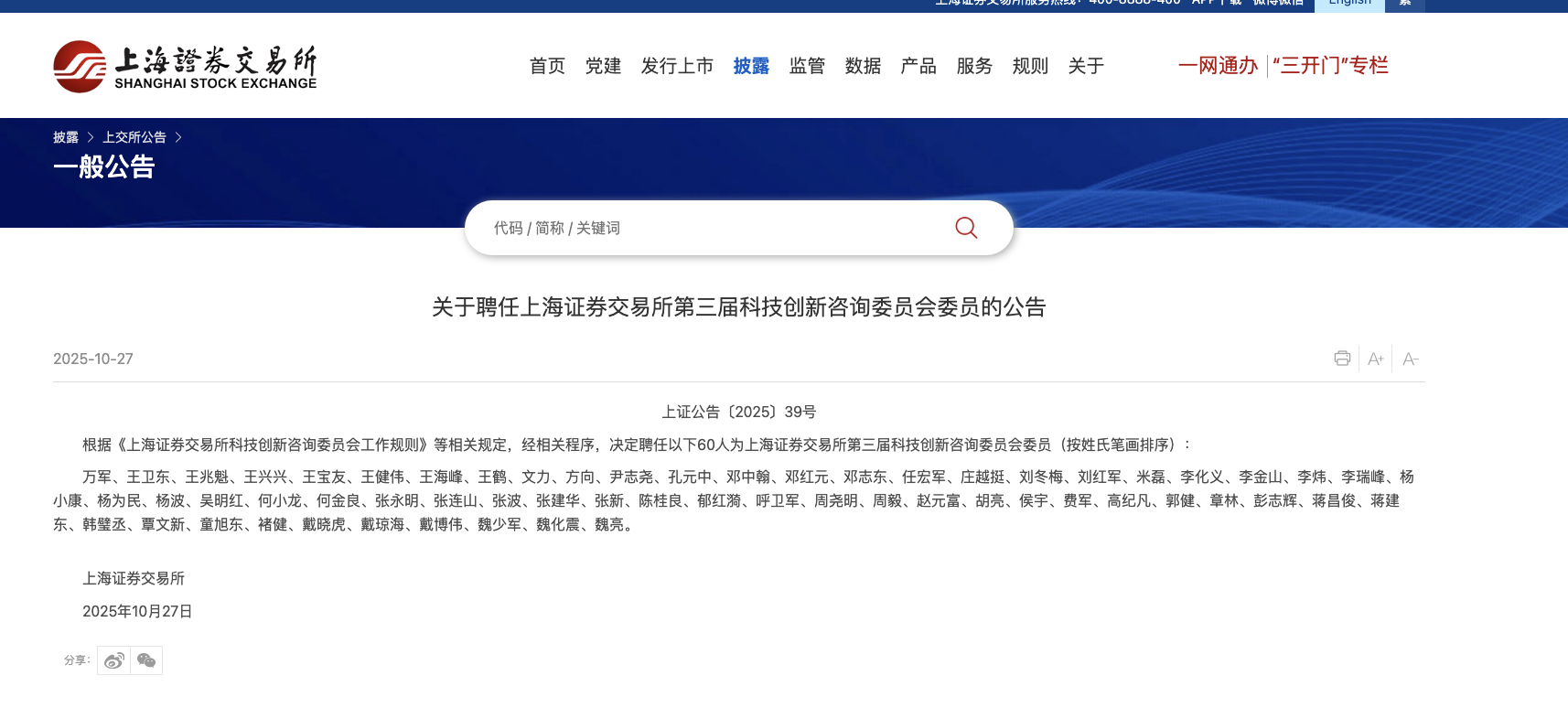 本報訊 (記者毛藝融)10月27日晚,上交所官網(wǎng)發(fā)布消息稱,已聘任第三屆科技創(chuàng)新咨詢委員會(以下簡稱“咨詢委”)委員,并向社會公布。