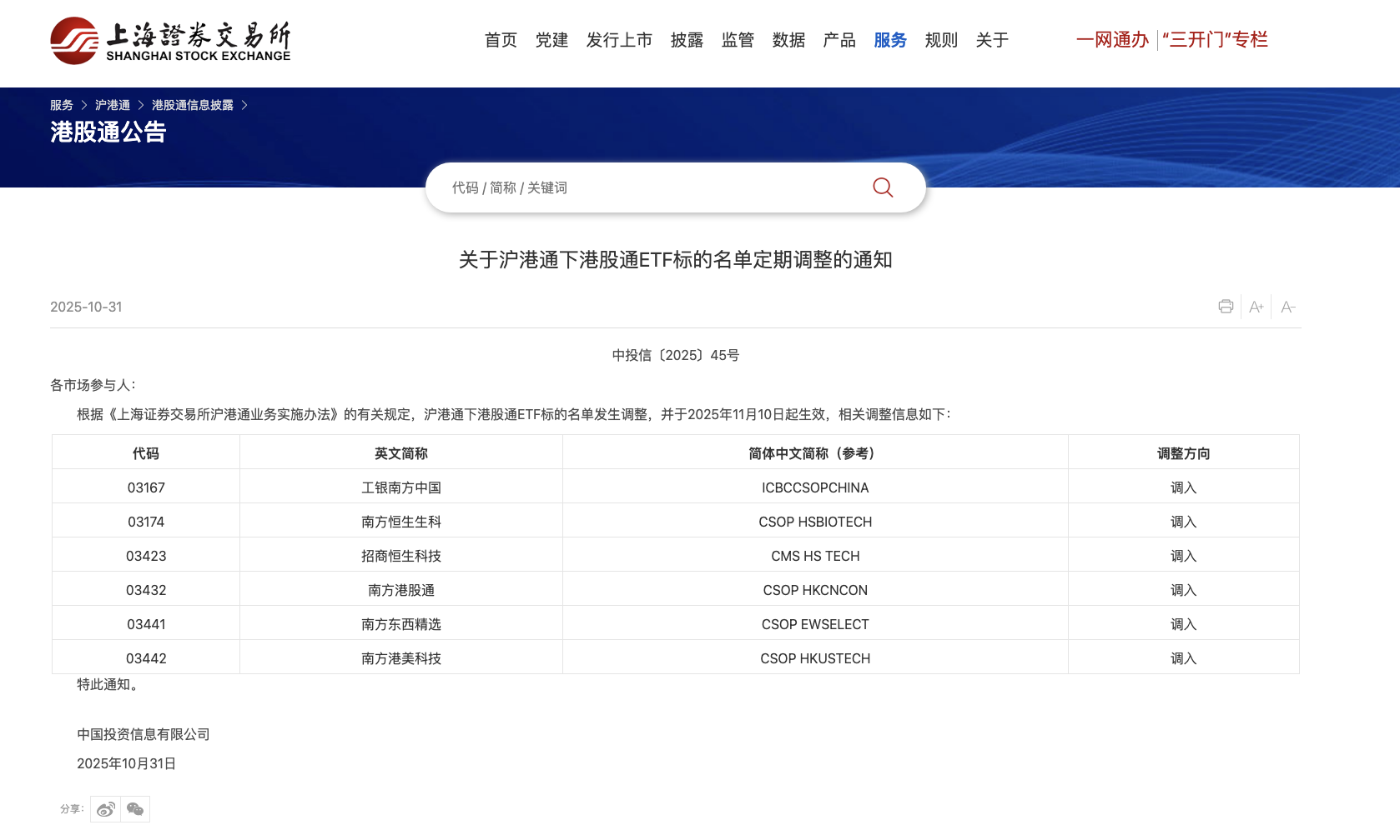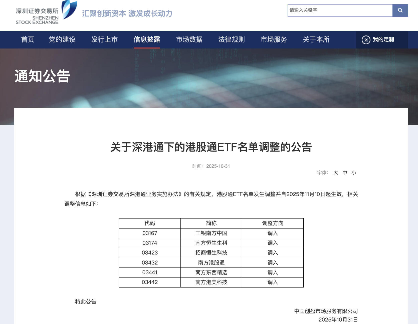 10月31日,記者從滬深交易所官網(wǎng)獲悉,“南向ETF通”最新擴(kuò)容名單出爐。根據(jù)《上海證券交易所滬港通業(yè)務(wù)實(shí)施辦法》《深圳證券交易所深港通業(yè)務(wù)實(shí)施辦法》的有關(guān)規(guī)定,港股通ETF標(biāo)的名單發(fā)生調(diào)整,并于2025年11月10日起生效。