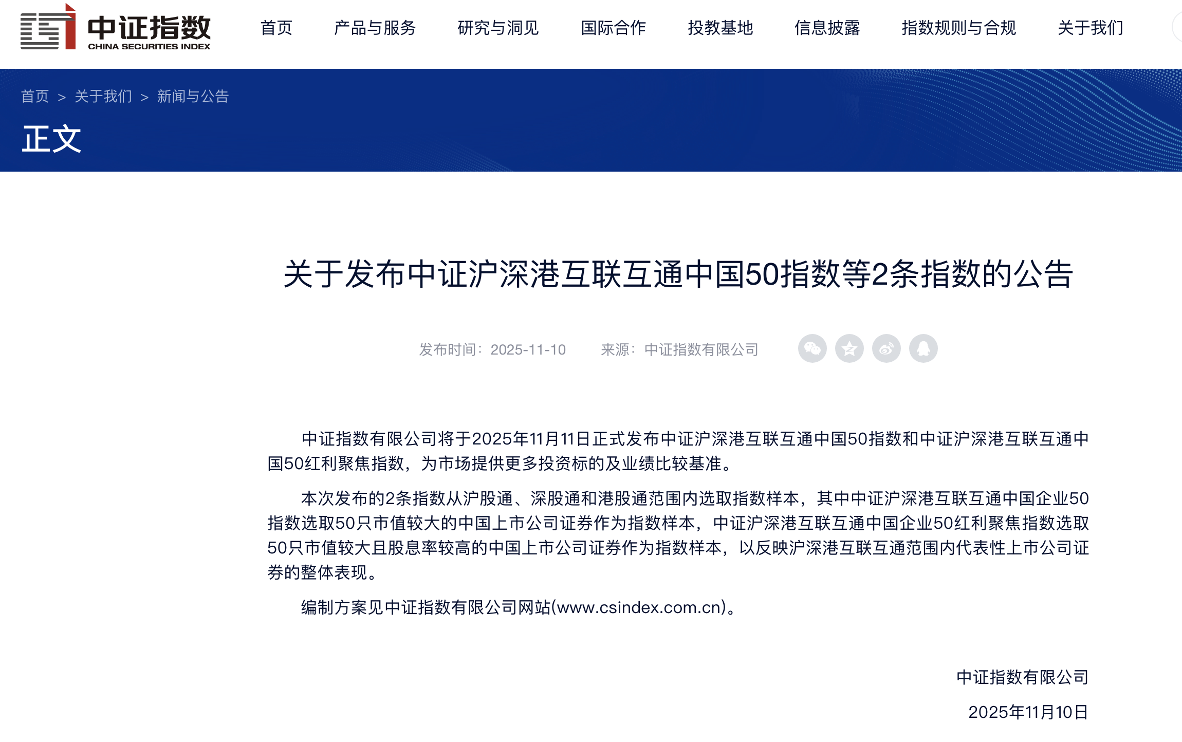 本報訊 (記者毛藝融)11月10日,中證指數(shù)有限公司在官網(wǎng)公告稱,將于2025年11月11日正式發(fā)布中證滬深港互聯(lián)互通中國50指數(shù)和中證滬深港互聯(lián)互通中國50紅利聚焦指數(shù),為市場提供更多投資標的及業(yè)績比較基準。