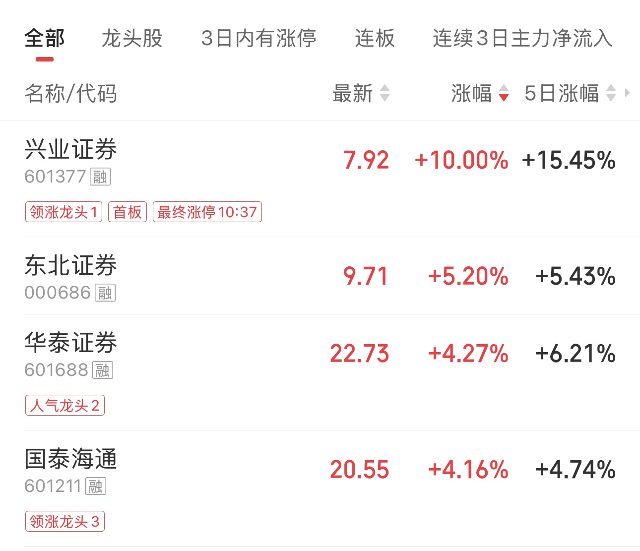 除因并購(gòu)重組事項(xiàng)停牌的中金公司、信達(dá)證券、東興證券外,板塊內(nèi)其余47只個(gè)股全線飄紅,興業(yè)證券漲停,半日成交額達(dá)47.62億元;東北證券漲超5%,華泰證券、國(guó)泰海通均漲超4%;行業(yè)龍頭中信證券半日成交額超65億元。