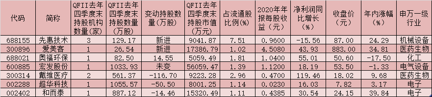 新進(jìn)增持方面,截至2020年四季度末,QFII新進(jìn)先惠技術(shù)、愛美客等2只個股,持股數(shù)量分別為129.17萬股、26.54萬股,并對奧福環(huán)保進(jìn)行繼續(xù)加倉操作,QFII增持?jǐn)?shù)量為14.55萬股,最新持股數(shù)量為82.50萬股。