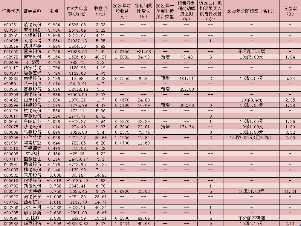 事實(shí)上,鋼鐵行業(yè)上市公司派現(xiàn)“紅包”豪氣十足,引人矚目。統(tǒng)計(jì)顯示,在上述已披露年報(bào)的上市公司中,有10家鋼鐵公司發(fā)布2020年年度分紅方案(含已實(shí)施分紅方案及發(fā)布分紅預(yù)案的公司),方大特鋼分紅最為慷慨,擬每10股派11元(含稅),緊隨其后的是中信特鋼,該公司去年分紅方案為每10股派7元(含稅),此方案已實(shí)施;安寧股份擬每10股派5元(含稅)。
