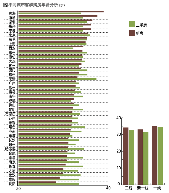 貝殼研究院以40城為研究樣本,成交數(shù)據(jù)測(cè)算了購(gòu)房者的實(shí)際購(gòu)房年齡,新房和二手購(gòu)房者平均年齡在33.3歲左右。分二手房、新房看,一線城市購(gòu)買新房的平均年齡約為34.4歲,購(gòu)買二手房的平均年齡約為35.1歲,兩者相差將近一歲。分具體城市看,天津人二手房購(gòu)買年齡最晚,為37.2歲;成都最早,為31.6歲。在高能級(jí)城市,受制于城市高房?jī)r(jià)及限購(gòu)政策等影響,消費(fèi)者購(gòu)房置業(yè)難度相對(duì)較大,需要更長(zhǎng)時(shí)間財(cái)富積累才能實(shí)現(xiàn)。