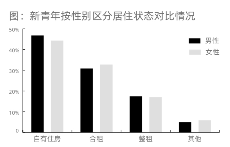 報(bào)告顯示,租房仍是新青年的主流,約49.2%的受訪者目前正租房居住,約45.3%受訪者的居住狀態(tài)是自有住房。無(wú)論男性還是女性,合租均是主流的租賃方式,但男性受訪者自有住房的占比相對(duì)更高。