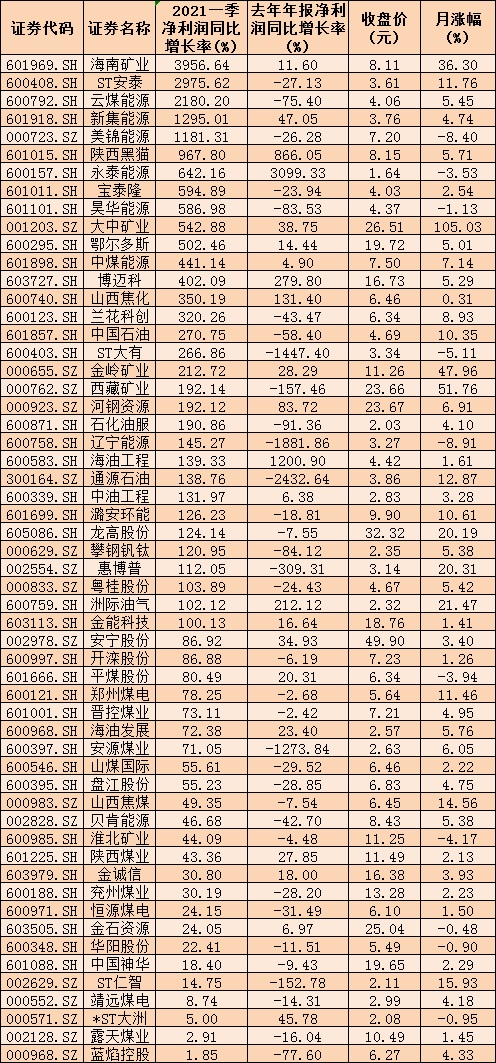 從個股方面來看,采掘行業(yè)中,有56家公司一季報凈利潤同比實現(xiàn)增長,占行業(yè)內(nèi)成份股的83.58%。其中,海南礦業(yè)、ST安泰、云煤能源、新集能源、美錦能源等5只個股,凈利潤同比增幅均超10倍,分別為3956.64%、2975.62%、2180.2%、1295.01%、1181.3%。