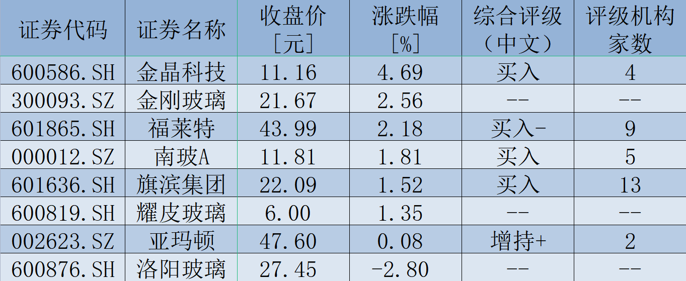 值得一提的是,最近30日內(nèi),有5只玻璃制造板塊個股獲機構(gòu)給予“買入”或“增持”等看好評級。其中,旗濱集團和福萊特分別獲得13次和9次看好評級,南玻A(5次)、金晶科技(4次)、亞瑪頓(2次)等3只個股也獲得了機構(gòu)給予的看好評級。