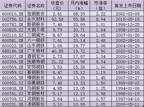 表:月內(nèi)股價(jià)漲幅在10%以上的鋼鐵股一覽