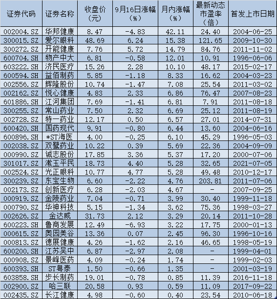 在9月份以來的這波反彈中,醫(yī)美股的分化趨勢已有所體現,期間有31只醫(yī)美概念股呈現不同程度的上漲,占行業(yè)內成份股比例為60.78%,華邦健康、愛爾眼科、開能健康、物產中大、濟民醫(yī)療等個股期間累計漲幅均在10%以上。反觀出現下跌的個股,超半數最新動態(tài)市盈率在50倍以上,國際醫(yī)學、愛美客、貝泰妮、華熙生物等4只個股最新動態(tài)市盈率均高于100倍。