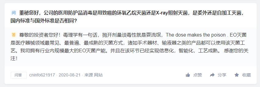 事實上,早在去年防疫物資大規(guī)模生產(chǎn)的時候,就有用戶向口罩生產(chǎn)商提出過類似問題:防護品消毒是用環(huán)氧乙烷滅菌還是X-ray照射滅菌?當時,一家上市公司的答復也很幽默:“毒理學有一句話,拋開劑量談毒性就是耍流氓,EO(環(huán)氧乙烷)滅菌是醫(yī)療器械領域最常見、最普遍、最成熟的滅菌方式,諸如手術(shù)器材、輸液器之類的產(chǎn)品都可以使用該滅菌工藝。”