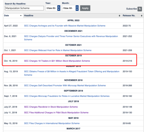 美國證監(jiān)會官網(wǎng)展示的與操縱股票市場相關(guān)的事件,從2012年至今共19起。突出顯示的公告是2019年10月對于18名股票交易者的起訴,和本次的案件同屬一樁