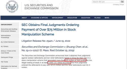 美國證監(jiān)會官網(wǎng)發(fā)布的處罰通知,其中說明了本次股票操縱案涉及超過3000只美股,非法獲利超過3500萬美元