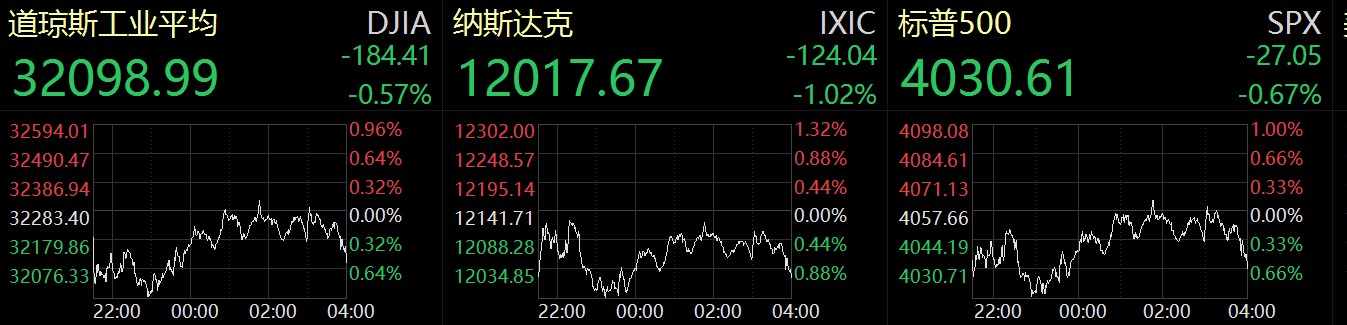 個股來看,科技股普跌,超威半導體跌2.95%,英偉達跌2.82%,蘋果跌1.37%,微軟跌1.07%,推特跌1.04%,谷歌-C跌0.86%,亞馬遜跌0.73%;中概股漲跌不一,拼多多漲14.71%,高途漲11.73%,名創(chuàng)優(yōu)品漲4.16%,知乎漲2.13%,新東方漲0.71%,嗶哩嗶哩跌5.11%,每日優(yōu)鮮跌7.69%,網(wǎng)易有道跌9.29%。