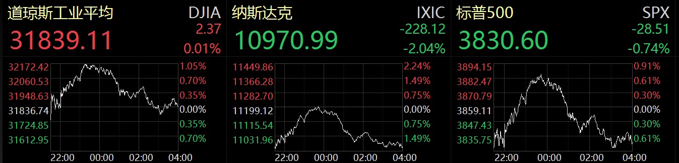 當(dāng)?shù)貢r間10月26日,美股三大指數(shù)收盤漲跌不一,其中,道瓊斯指數(shù)漲0.01%,報(bào)31839.11點(diǎn);標(biāo)普500指數(shù)跌0.74%,報(bào)3830.60點(diǎn);納斯達(dá)克指數(shù)跌2.04%,報(bào)10970.99點(diǎn)。其中,納斯達(dá)克指數(shù)和標(biāo)普500指數(shù)終結(jié)連續(xù)3個交易日的上漲行情。