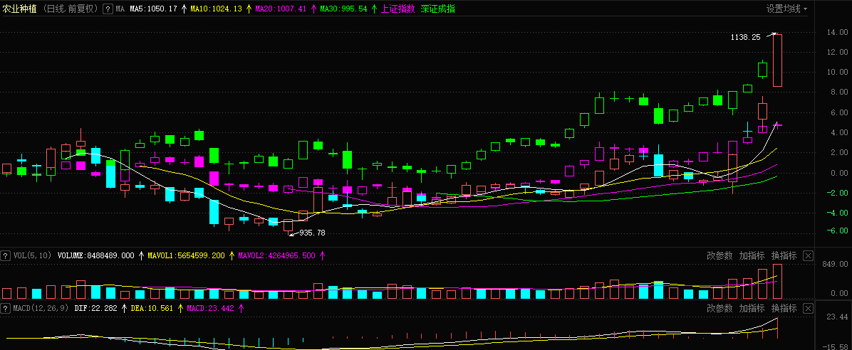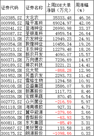 大量資金推動(dòng)了農(nóng)業(yè)種植板塊的上漲,數(shù)據(jù)顯示,本周板塊內(nèi)23只個(gè)股合計(jì)大單凈額流入高達(dá)19.41億元,其中17只個(gè)股凈流入,流入額最高的是隆平高科,達(dá)到6.90億元,大北農(nóng)、登海種業(yè)、農(nóng)發(fā)種業(yè)、豐樂(lè)種業(yè)、敦煌種業(yè)緊隨其后,周大單凈額均超過(guò)1億元。如此大的資金必然激起板塊內(nèi)個(gè)股的大漲,其中,大北農(nóng)本周的4個(gè)交易日內(nèi)連續(xù)漲停,周漲幅高達(dá)46.36%,隆平高科、登海種業(yè)、荃銀高科、農(nóng)發(fā)種業(yè)、敦煌種業(yè)、豐樂(lè)種業(yè)、新農(nóng)開(kāi)發(fā)、萬(wàn)向德農(nóng)、神農(nóng)科技、北大荒、蘇墾農(nóng)發(fā)、雪榕生物等12只個(gè)股周漲幅也均超過(guò)10%。