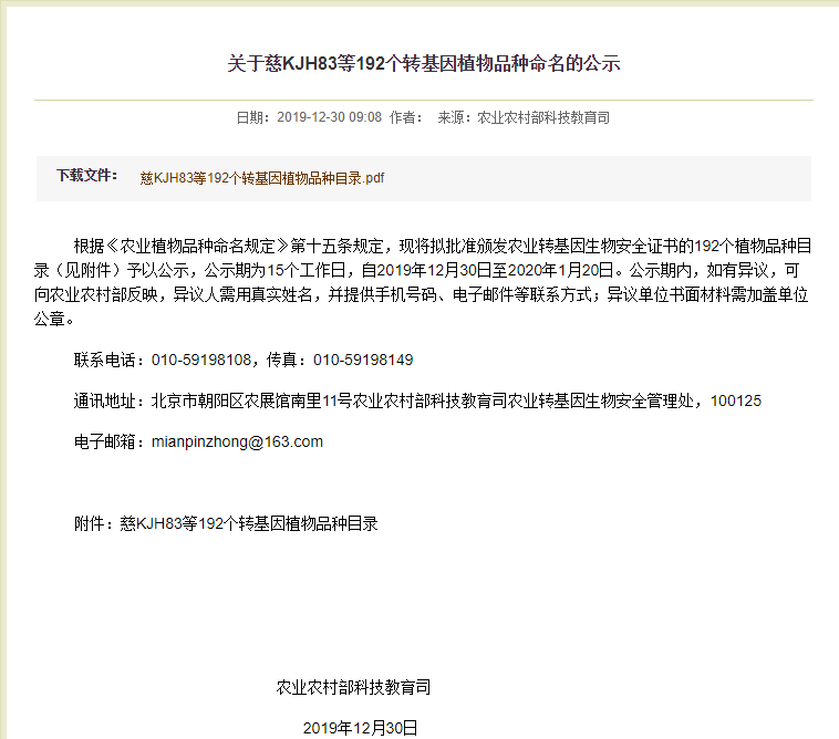 此外,在2019年12月30日,農(nóng)業(yè)農(nóng)村部科技教育司發(fā)布《關(guān)于慈KJH83等192個(gè)轉(zhuǎn)基因植物品種命名的公示》,擬批準(zhǔn)為192個(gè)植物品種目錄頒發(fā)農(nóng)業(yè)轉(zhuǎn)基因生物安全證書(shū),公示期為15個(gè)工作日,自2019年12月30日至2020年1月20日。