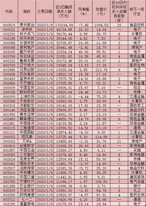 《證券日報》記者根據(jù)同花順數(shù)據(jù)統(tǒng)計發(fā)現(xiàn),1月2日至1月6日的3個交易日里,滬深兩市共有1077只兩融標的股實現(xiàn)融資凈買入,其中累計融資凈買入額超1億元的兩融標的股達到41只,貴州茅臺(17.02億元)、深科技(4.31億元)、科大訊飛(3.62億元)、華天科技(3.50億元)、長信科技(3.27億元)、保利地產(chǎn)(3.04億元)、晶方科技(2.33億元)、華友鈷業(yè)(2.14億元)和魯商發(fā)展(2.02億元)等9只個股期間累計融資凈買入額均達到2億元以上。另外,包括遼寧成大、兆易創(chuàng)新、風華高科、藍思科技、天齊鋰業(yè)、中國寶安等在內(nèi)的32只個股期間累計融資凈買入額均達到或超過1億元,上述41只個股合計融資凈買入額達到86.53億元。