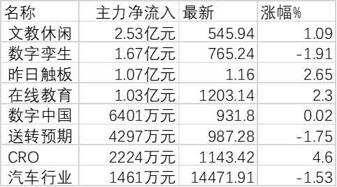 從大單資金流向來看,僅文教休閑(2.53億元)、數(shù)字孿生(1.67億元)、昨日觸板(1.07億元)、在線教育(1.03億元)、數(shù)字中國(6401萬元)、送轉(zhuǎn)預(yù)期(4297萬元)、CRO(2224萬元)、汽車行業(yè)(1461萬元)等8類板塊呈資金凈流入狀態(tài);大單資金流出的板塊則集中在融資融券(-210億元)、富時(shí)概念(-174億元)、標(biāo)普概念(-158億元)、證金持股(-134億元)、深股通(-109億元)等,資金流出金額均在100億元之上。