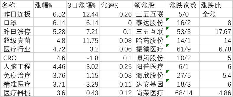 從板塊走勢(shì)來看,上午有61類板塊上漲,昨日連板(6.52%)、口罩(6.14%)、昨日漲停(5.28%)、超級(jí)真菌(4.8%)、醫(yī)療行業(yè)(4.72%)、CRO(4.6%)、人腦工程(4.46%)、免疫治療(3.76%)、精準(zhǔn)醫(yī)療(3.71%)、醫(yī)療器械(3.6%)等板塊居漲幅榜前10位;有272類板塊下跌,旅游酒店(-5.68%)、工藝商品(-5.43%)、在線旅游(-5.41%)、裝修裝飾(-4.99%)、雞肉概念(-4.92%)、園林工程(-4.78%)、船舶制造(-4.65%)、賽馬概念(-4.58%)、白酒(-4.49%)、海南板塊(-4.32%)等板塊居跌幅榜前10位。