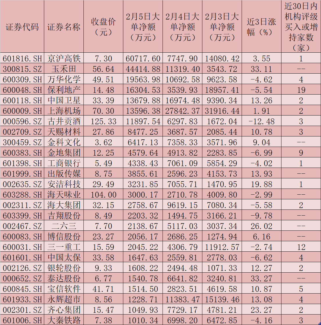 進(jìn)一步統(tǒng)計(jì)發(fā)現(xiàn),有25只個(gè)股近3日累計(jì)大單資金凈流入超過1億元,京滬高鐵、上海機(jī)場(chǎng)、玉禾田、中國(guó)衛(wèi)星、萬(wàn)華化學(xué)、保利地產(chǎn)、永輝超市等7只個(gè)股近3日均受到2億元以上大單資金搶籌,包括古井貢酒、海大集團(tuán)、三一重工、金科文化、工商銀行、大秦鐵路、天賜材料等在內(nèi)的18只個(gè)股期間累計(jì)大單資金凈流入也均超過1億元。