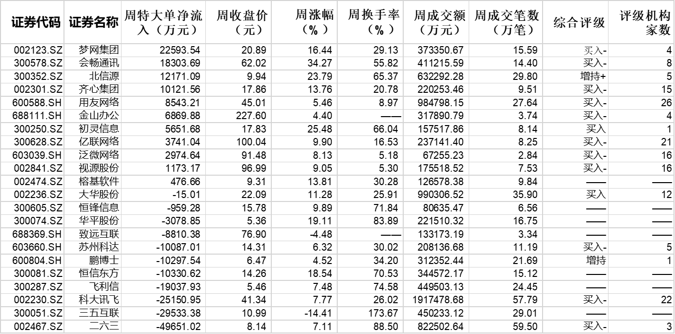 個股表現(xiàn)方面,上周板塊內交易中的22只個股呈普漲格局,有20只個股上漲,2只個股下跌,上漲股占比90.91%,會暢通訊、初靈信息和北信源期間漲幅居前,周漲幅均超23%,此外,尚有包括華平股份、恒信東方、夢網(wǎng)集團等在內的6只個股周漲幅超10%。從特大單資金流向來看,上周板塊中有11只個股呈特大單凈買入態(tài)勢,合計買入9.26億元,其中,夢網(wǎng)集團特大單凈流入額位居板塊首位,累計凈買入22593.54萬元,會暢通訊和北信源排在第二和第三位,凈買入額分別達18303.69萬元和12171.09萬元。