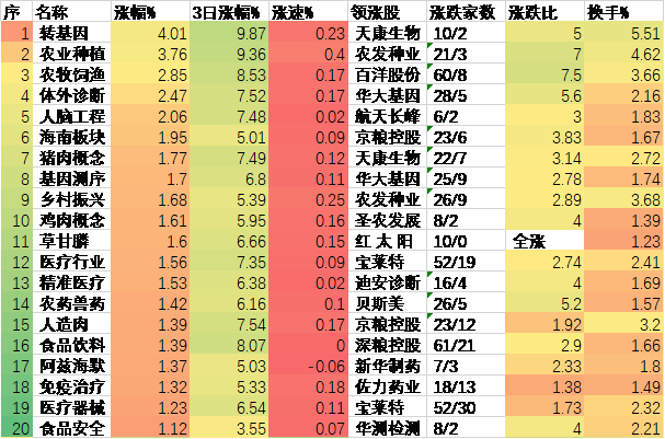 從板塊走勢來看,截至早盤收盤,有57類板塊上漲,占比16.81%,轉(zhuǎn)基因(4.01%)、農(nóng)業(yè)種植(3.76%)、農(nóng)牧飼漁(2.85%)等板塊居前3位;有282類板塊下跌,電信運營(-2.72%)、輸配電氣(-2.29%)、智能電網(wǎng)(-2.1%)等板塊居前3位。