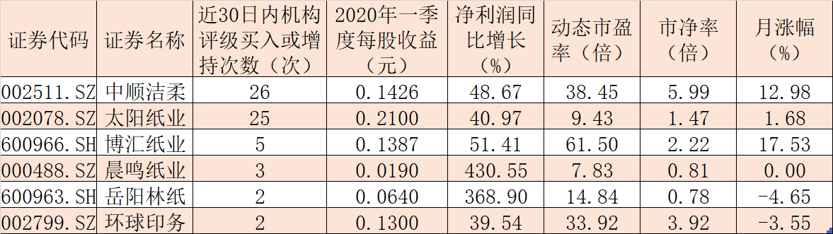 在紙價上漲的支撐下,部分績優(yōu)股受到機構(gòu)的關(guān)注。統(tǒng)計顯示,在上述15只一季度凈利潤實現(xiàn)增長的個股中,中順潔柔(26次)、太陽紙業(yè)(25次)、博匯紙業(yè)(5次)、晨鳴紙業(yè)(3次)、岳陽林紙(2次)和環(huán)球印務(wù)(2次)等6只績優(yōu)股近30日內(nèi)獲得機構(gòu)給予“買入”或“增持”等看好評級,后市配置機會凸顯。