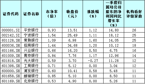 表:機(jī)構(gòu)看好評級居前的銀行股一覽
