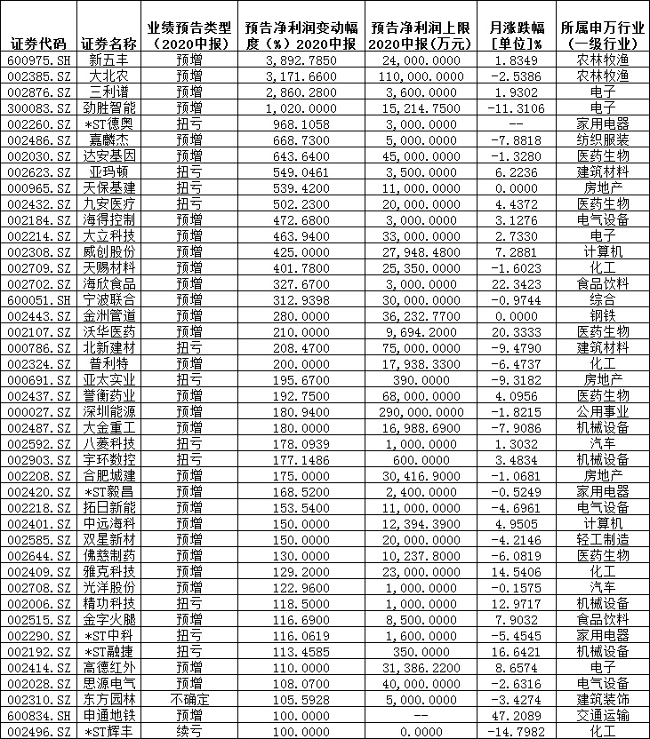 進一步梳理可見,在已發(fā)布中報業(yè)績預告的公司中,有43家公司凈利潤同比有望實現(xiàn)翻番。其中,新五豐、大北農(nóng)、三利譜和勁勝智能等4家公司預計今年上半年凈利潤增幅上限在10倍以上,分別為3892.785%、3171.66%、2860.28%和1020%。緊隨其后的是*ST德奧、嘉麟杰、達安基因、亞瑪頓、天保基建和九安醫(yī)療等6家公司,凈利潤同比增幅均超500%。