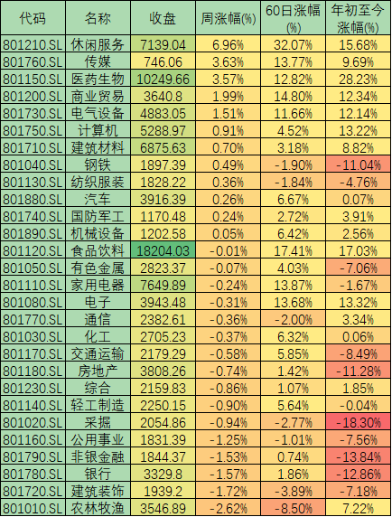 從盤面看,滬深兩市共1323只個股上漲,占比34.57%,有2452只個股下跌。行業(yè)板塊方面(申萬一級),休閑服務(wù)(6.96%)、傳媒(3.63%)、醫(yī)藥生物(3.57%)等漲幅居前三。