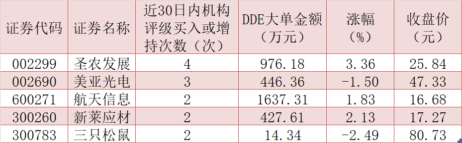 機(jī)構(gòu)評級方面,包括安信證券、中信證券等在內(nèi)的多家機(jī)構(gòu)均一直看好部分個股的后市表現(xiàn)。上述被大單資金青睞的17只概念股中,圣農(nóng)發(fā)展、美亞光電、航天信息、新萊應(yīng)材、三只松鼠等5只概念股近30日內(nèi)均受到機(jī)構(gòu)兩次及以上給予“買入”或“增持”等看好評級,后市表現(xiàn)值得關(guān)注。