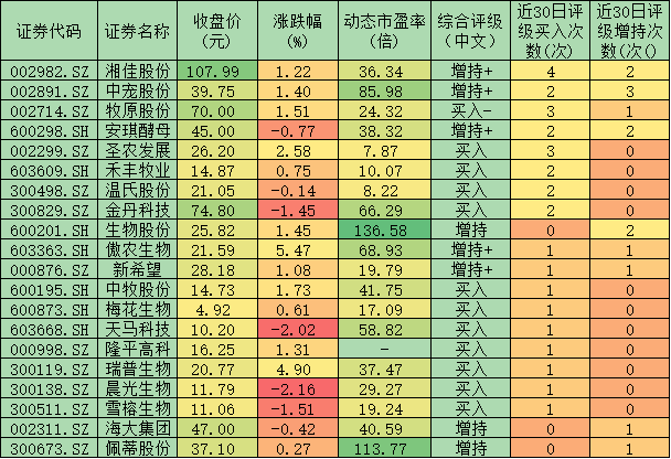 從機(jī)構(gòu)評(píng)級(jí)來看,近30日內(nèi)有20家農(nóng)林牧漁行業(yè)公司獲得評(píng)級(jí)機(jī)構(gòu)的43次推薦類評(píng)級(jí),其中,湘佳股份獲得機(jī)構(gòu)4次買入評(píng)級(jí)和2次增持評(píng)級(jí),此外,包括中寵股份、牧原股份、安琪酵母等在內(nèi)的7只個(gè)股獲得機(jī)構(gòu)2次以上推薦評(píng)級(jí)。