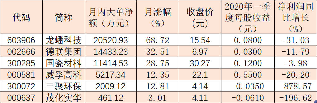 表:6月份以來實(shí)現(xiàn)大單資金凈流入個(gè)股