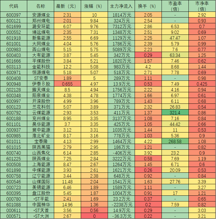 具體個股表現(xiàn)來看,煤炭采選板塊36只交易中的成份股,有35只上漲,其中,安源煤業(yè)和鄭州煤電漲停報收,另外包括潞安環(huán)能(9.76%)、靖遠煤電(7.31%)、新集能源(6.69%)等在內(nèi)的11只個股漲幅均超過5%。