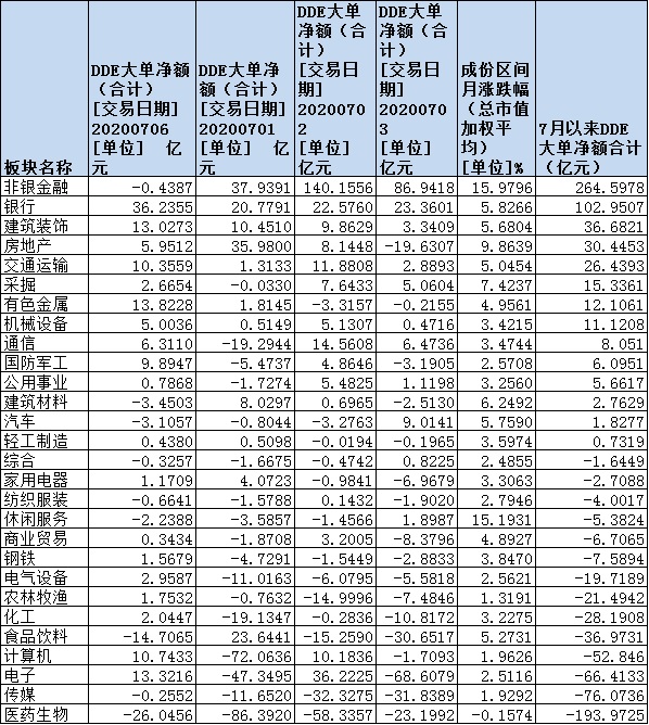 各路資金展開(kāi)了調(diào)倉(cāng)換股。7月以來(lái)的4個(gè)交易日中,市場(chǎng)呈現(xiàn)出資金凈流入態(tài)勢(shì)。從申萬(wàn)一級(jí)行業(yè)來(lái)看,非銀金融和銀行等兩行業(yè)期間資金凈流入均超百億元,分別為264.6億元和102.9億元,合計(jì)達(dá)367.5億元,成為資金追捧的重點(diǎn)領(lǐng)域。而此前漲幅居前的醫(yī)藥生物行業(yè)期間累計(jì)資金凈流出達(dá)193.9億元。