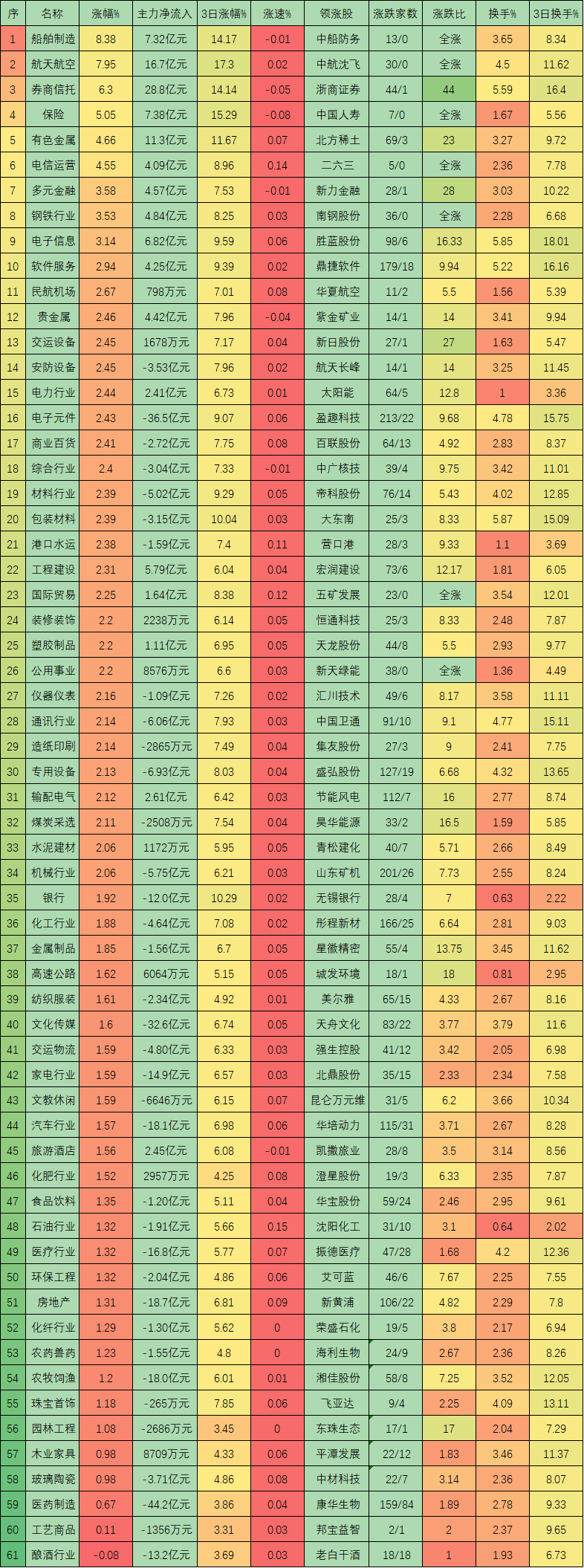 兩市A股呈普漲格局,共3216只個股上漲,567只下跌。行業(yè)板塊方面,61類東方財富行業(yè)板塊中60類上漲,船舶制造(8.38%)、航天航空(7.95%)、券商信托(6.3%)等三類漲幅居前。
