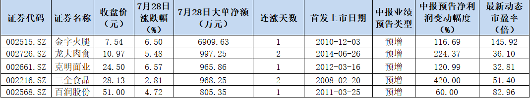 資金流向方面,7月28日,上述5只個股均實現(xiàn)大單資金凈流入,金字火腿大單資金凈流入居首達到6909.63萬元。