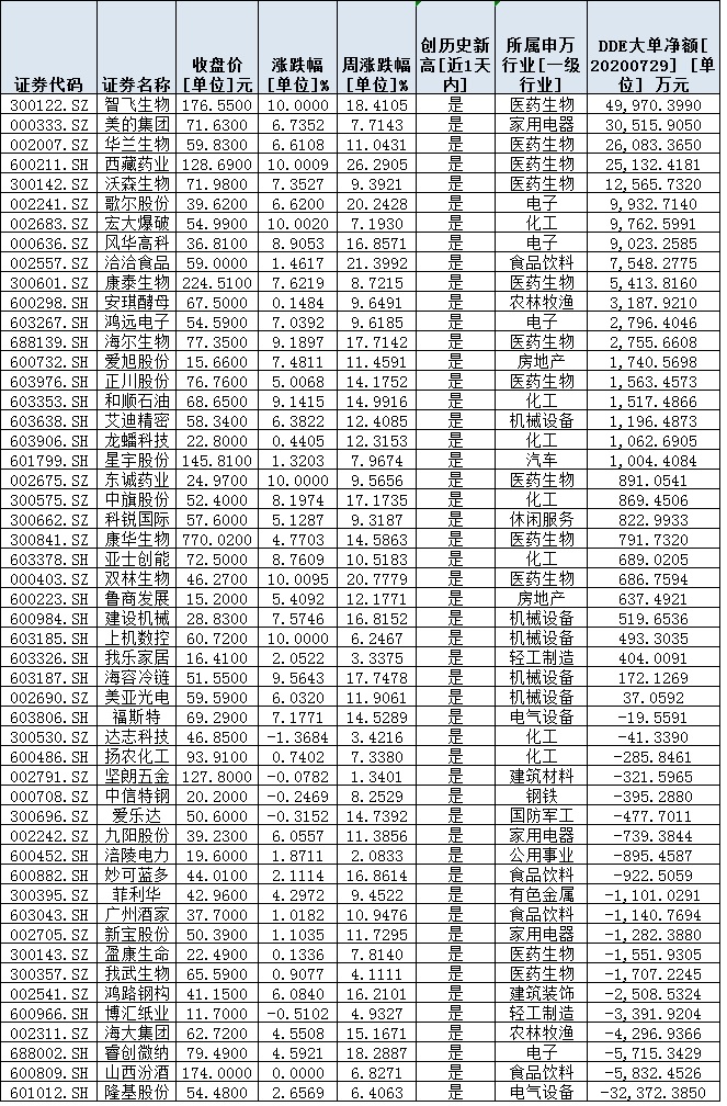 從資金流向來看,統(tǒng)計發(fā)現(xiàn),7月29日,在上述51只個股中,有31只個股呈現(xiàn)大單資金凈流入狀態(tài),占比逾六成。其中,智飛生物、美的集團(tuán)、華蘭生物、西藏藥業(yè)、沃森生物