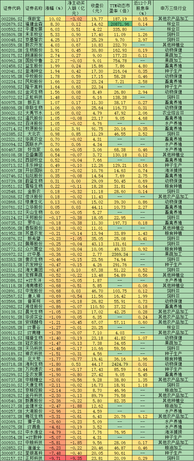 表:周一農(nóng)林牧漁股市場(chǎng)表現(xiàn)一覽