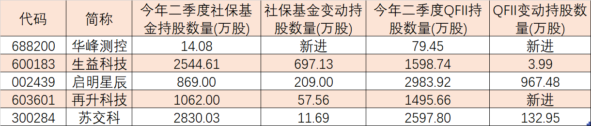 進(jìn)一步統(tǒng)計(jì)發(fā)現(xiàn),有5家公司股票成為今年二季度社保基金與QFII共同新進(jìn)增持的重點(diǎn)品種,上述兩類機(jī)構(gòu)投資風(fēng)格更偏向科技類龍頭股以及行業(yè)景氣度較高的績(jī)優(yōu)品種,增持資金達(dá)到11.82億元。具體來(lái)看,今年二季度社?;鹨约癚FII同時(shí)新進(jìn)持有華峰測(cè)控93.53萬(wàn)股,再升科技、啟明星辰、生益科技、蘇交科等4只個(gè)股今年二季度受上述兩類機(jī)構(gòu)繼續(xù)增持操作,增持?jǐn)?shù)量分別為1553.21萬(wàn)股、1176.49萬(wàn)股、701.12萬(wàn)股和144.64萬(wàn)股。