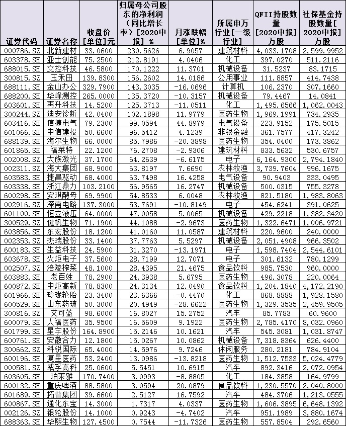 秉承長期投資、價(jià)值投資理念的社保基金持倉一直以來備受各方關(guān)注。在上述1110家凈利潤增長的公司中,截至今年上半年,包括順絡(luò)電子、湯臣倍健、利爾化學(xué)、廈門象嶼等在內(nèi)的197家公司的前十大流通股股東名單中有社?;瓞F(xiàn)身。另外,有106公司的前十大流通股股東名單中有QFII現(xiàn)身。進(jìn)一步梳理發(fā)現(xiàn),有43家公司同時(shí)被社?;鸷蚎FII持有,成為兩大機(jī)構(gòu)共同追捧的對(duì)象。