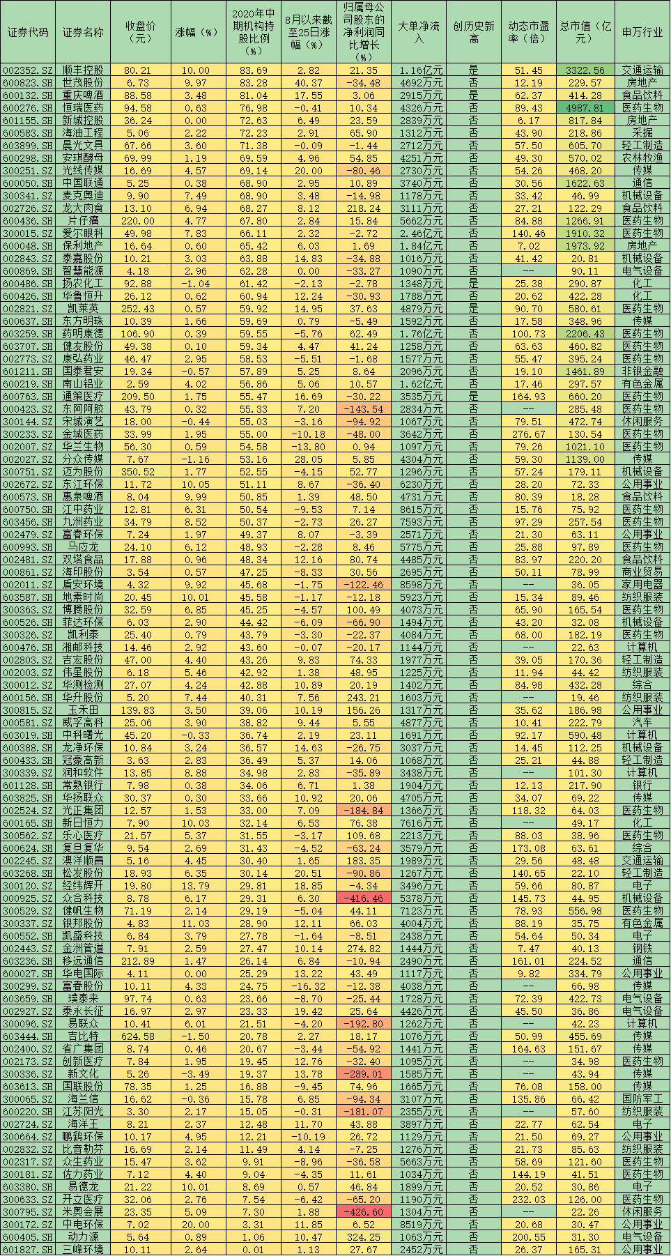 表:周三超1000萬元大單資金凈買入個(gè)股2020年中期機(jī)構(gòu)持股比例一覽