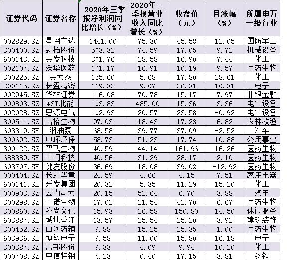 表:三季報凈利和營收雙增長的25家公司情況