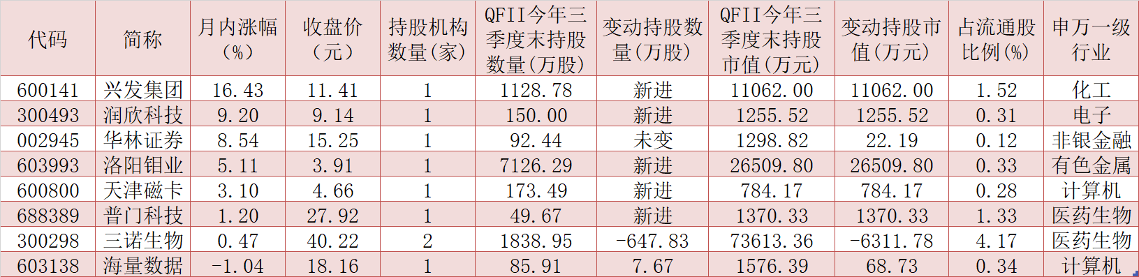 表:今年三季度獲QFII持倉的個股一覽(截至10月19日)
