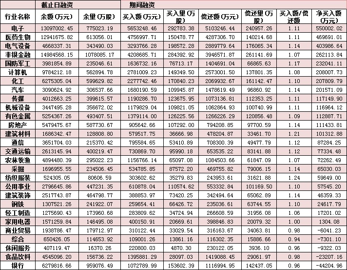 另外,非銀金融、國防軍工、計算機、化工、汽車等行業(yè)融資凈買入額也均在20億元以上。僅有銀行、食品飲料、休閑服務、綜合和商業(yè)貿易等五行業(yè)被融資客減持。