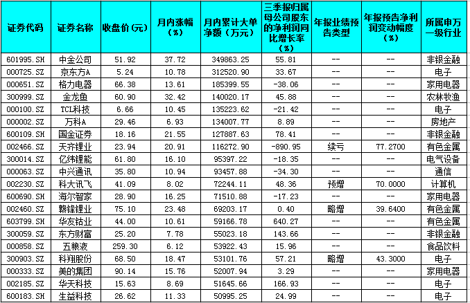 進一步梳理發(fā)現(xiàn),11月份首周,大單資金凈流入超10億元的個股中,非銀金融和電子行業(yè)均占兩席,有色金屬、房地產(chǎn)、家用電器、農林牧漁等行業(yè)則各有1只個股入圍。