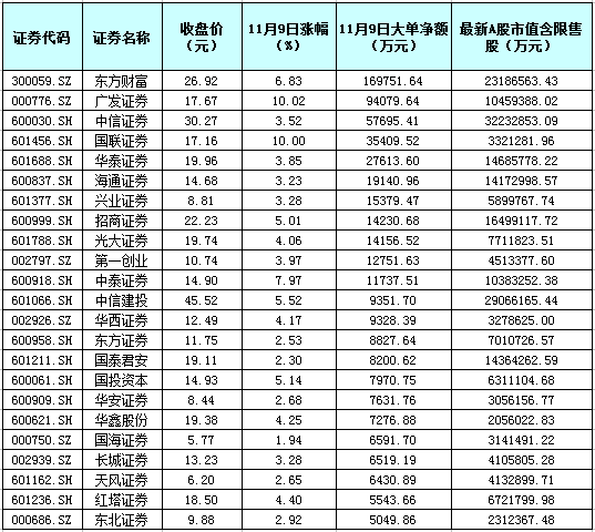 表:11月9日大單資金凈流入超5000萬元的券商股一覽