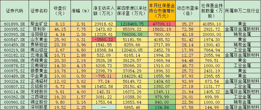 資金的流入增加了市場人氣也為部分長線資金帶來了較高浮盈。從社?;鸪止傻母∮瘉砜矗僭O(shè)社?;鹑径饶┮詠斫刂?1月9日持股數(shù)量未發(fā)生變化,其目前共持有紫金礦業(yè)、菲利華、洛陽鉬業(yè)等17只個(gè)股,以最新收盤價(jià)計(jì)算,其持股市值較三季度末增長12.10億元。如果單看11月份以來社?;鸪謧}有色金屬股的市值變化情況,則有9.61億元的賬面浮盈。